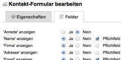 - Anzeigen/Ausblenden vordefinierter Formularfelder (z.B. Name, Adress-Block, Telefon, ...) und optionales Setzen als Pflichtfeld.